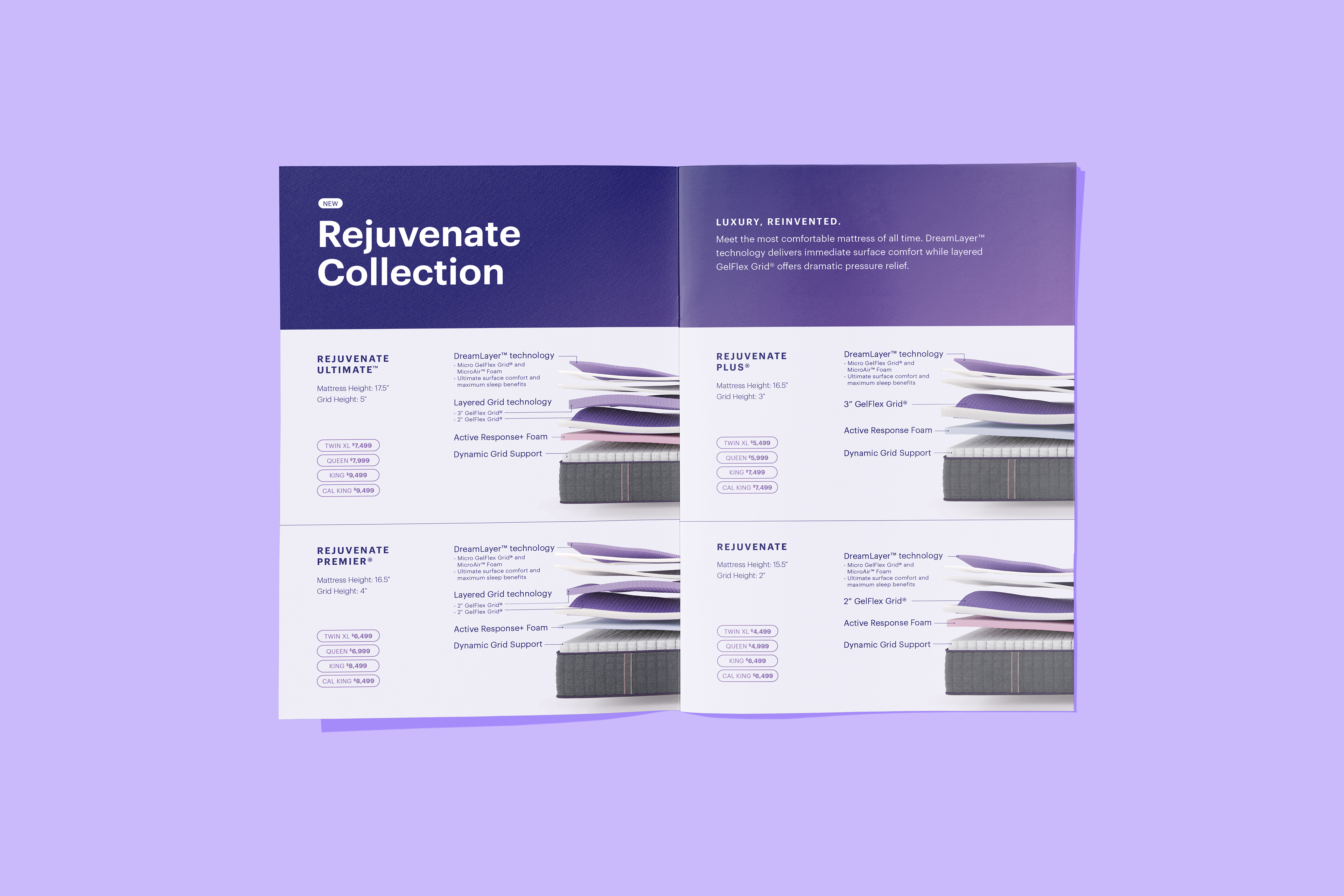 Purple's wholesale team participates in a semi-annual Las Vegas Market, and requires updated marketing materials to share with existing and prospective partners. This booklet was designed to provide a background to the brand, company history, and new product offerings.