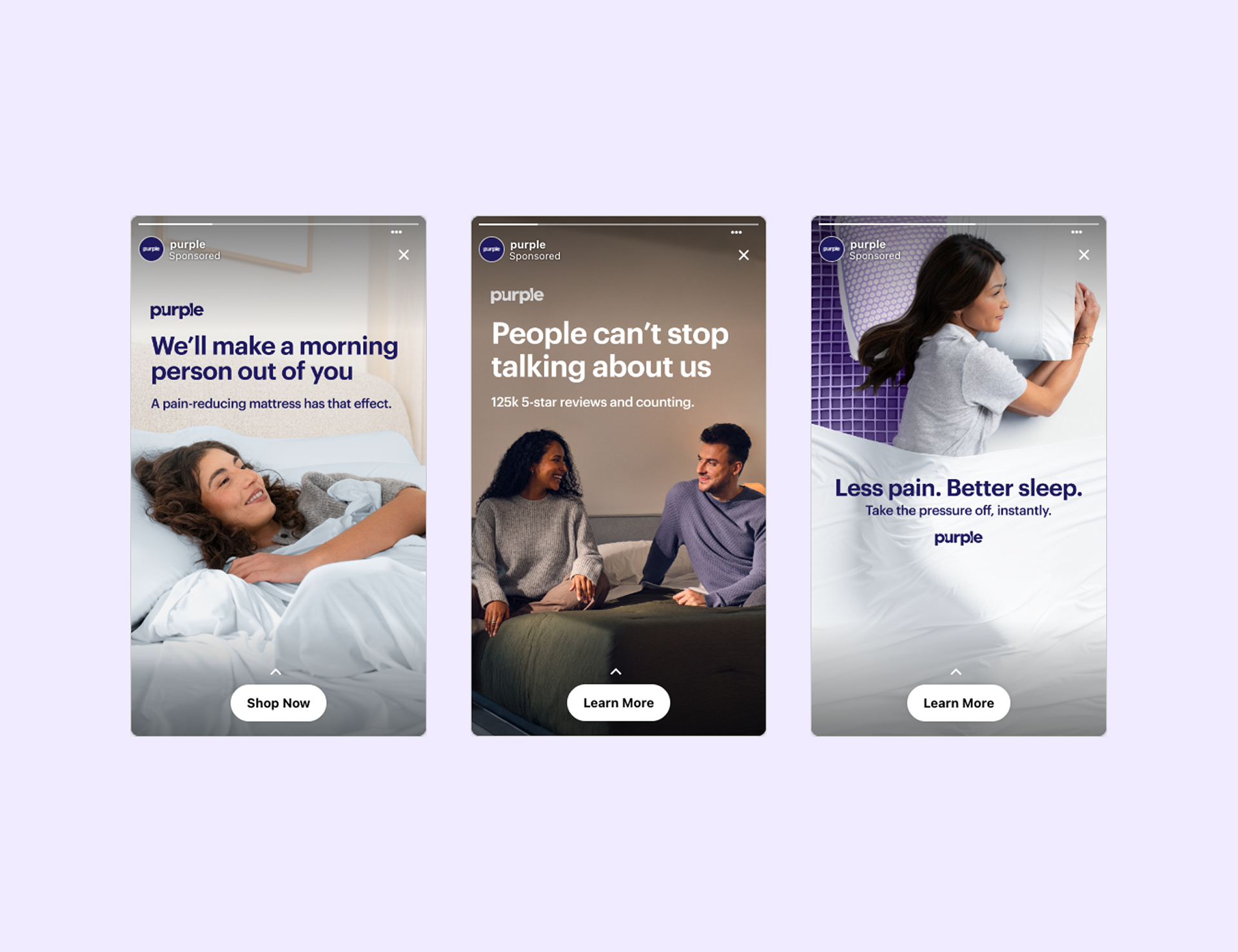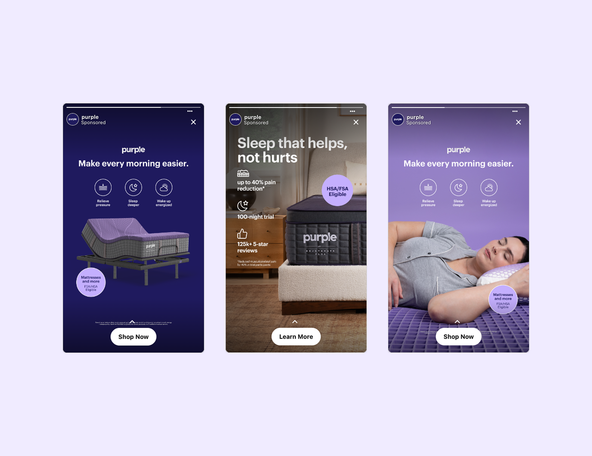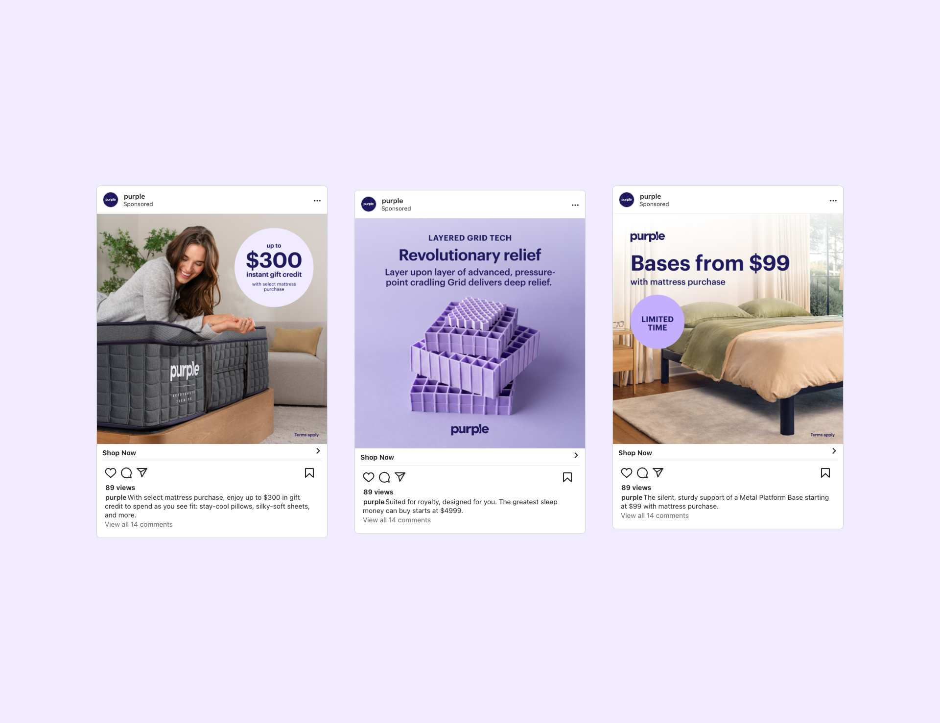 Throughout 2025, Purple's Design Team has worked closely with the Paid Marketing team to level up the impact of ads. We started creating ads for Meta, Snapchat, TikTok, Pinterest, and Reddit, and delivered new creative for testing on a bi-weekly basis. During promotional periods we worked to incorporate messaging and visuals that had been successful in other ads, while keeping the sale information clear. In just 6 months we found success within certain attributes of static, dynamic, and carousel posts.